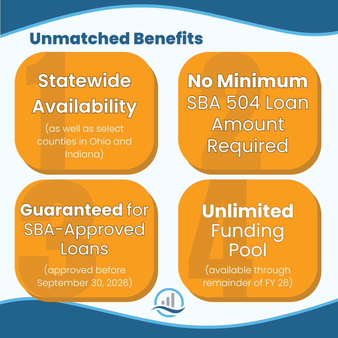 - Available to all opportunities located in Michigan and the counties in Indiana and Ohio that we are authorized by SBA to lend. For a complete list of counties in Indiana and Ohio please click here.